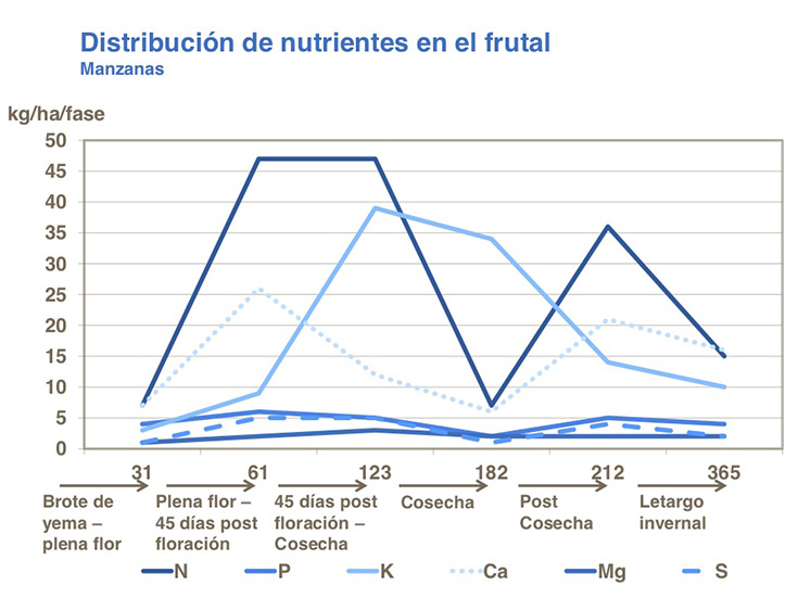 Calcio, potasio y nitrógeno son los macronutrientes más importantes que requiere una huerta. Es importante que existan cantidades importantes de calcio en el interior del árbol para apoyar un crecimiento sano. Mientras solo una pequeña proporción del calcio termina en el fruto, esa pequeña cantidad es importante y crítica e imprescindible para disminuir problemas de calidad durante el almacenaje.